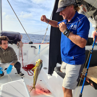 Es lief wieder mal nicht wie gewünscht mit der Reparatur am Autopiloten und so verbrachten wir noch 1 Woche im Hafen von Mindelo. Wir hatten uns schon in Sal vor angekündigt und bei der Ankunft direkt eine Nummer in der Warteschlange ergattert. Es hiss Montag oder Dienstag komme ein Mechaniker vorbei. Als am Dienstag dann immer noch niemand bei uns auftauchte, erkundigten wir uns im Büro. Unsere Rechnung war schon ausgestellt, obwohl noch niemand bei uns war? Es wurde also ein anderer Autopilot repartiert und wir wurden wieder in die Warteschlange gestellt. Alle waren langsam müde vom Warten und Jorge sollte am Montag 11.12.2022 seine Englisch Schule in Barbados starten. Die Zeit wurde immer knapper. Aber wir warteten und warteten, denn ohne Autopiloten los war auch keine Option. Thomas und ich waren die meiste Zeit auf dem Boot blockiert, da wir den Mechaniker nicht verpassen wollten. Die Crew verbrachte viel Zeit in der Sportsbar – WM Spiele schauen. Thomas und ich haben dann die Abende genutzt um Livemusik im Städtchen zu geniessen. An einem Abend hatten wir eine amüsante Begegnung mit Carlos Delgado, ein Urgestein von Mindelo. Er hat uns mit seinen Lebensgeschichten einen ganzen Abend lang unterhalten – dies sind Momente, die einem noch lange in Erinnerung bleiben. Die Reparatur an unserem Autopilot wurde am Freitagabend fertiggestellt. Am Samstag war dann der grosse Tag, alle waren froh, dass wir unsere Reise in die Karibik starten konnten. Zu diesem Zeitpunkt schien das Wetter gut zu sein, für die ersten Tage noch eher viel Wind, später dann schöner Passatwind für den Parasailor(dachten wir). Zuerst aber noch eine Geduldsprobe an der Tankstelle, warten war angesagt für 2h. Es wurde uns von zwei Personen versichert, dass die Tankstelle den ganzen Tag offen sei, aber wie so oft Kap Verde no stress. Aber dann gings los. Nein doch noch nicht, denn Thomas musste zuerst noch baden gehen, da unser LOG (Speed) wieder mal nicht arbeiten wollte. Aber dann auf ins Abenteuer… Momente die schwer festzuhalten sind.